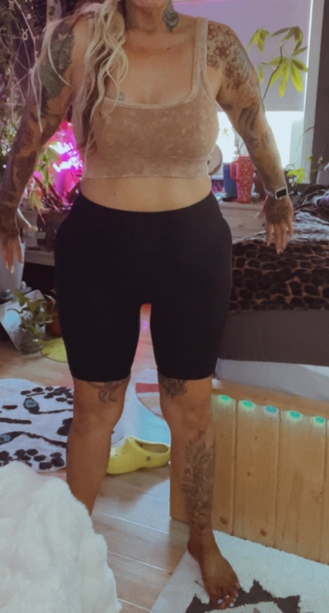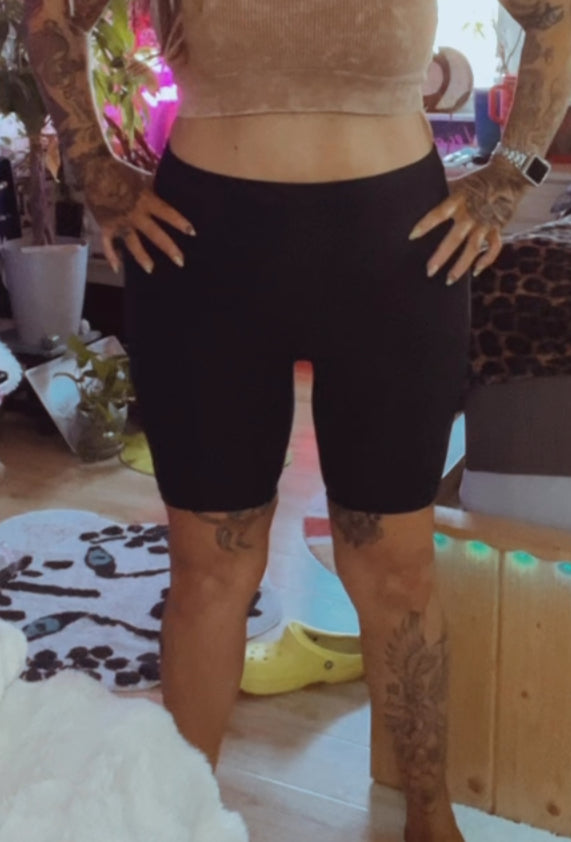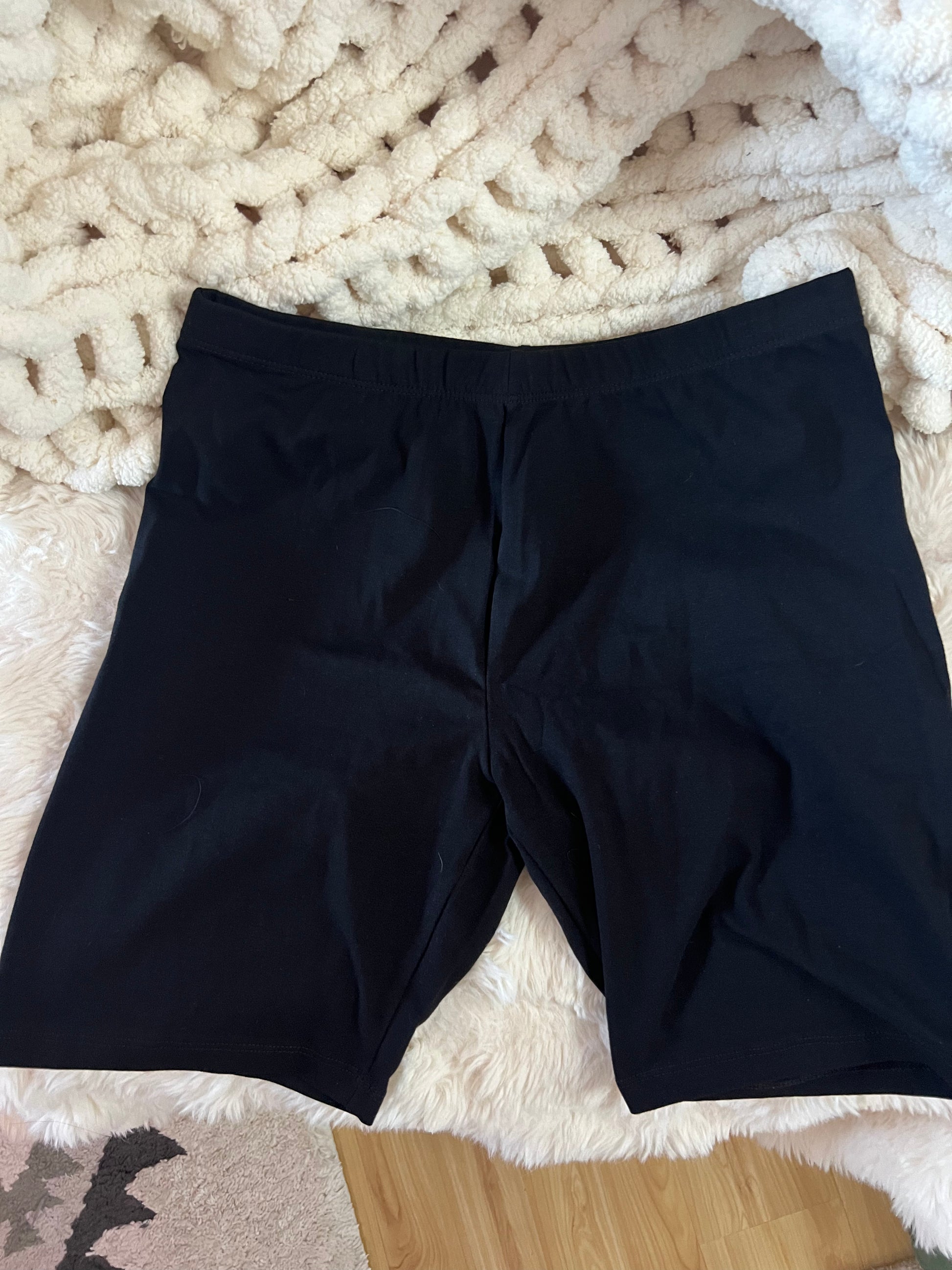 Perfect pair of black biker shorts. Mid thigh Length with elastic waistband.
