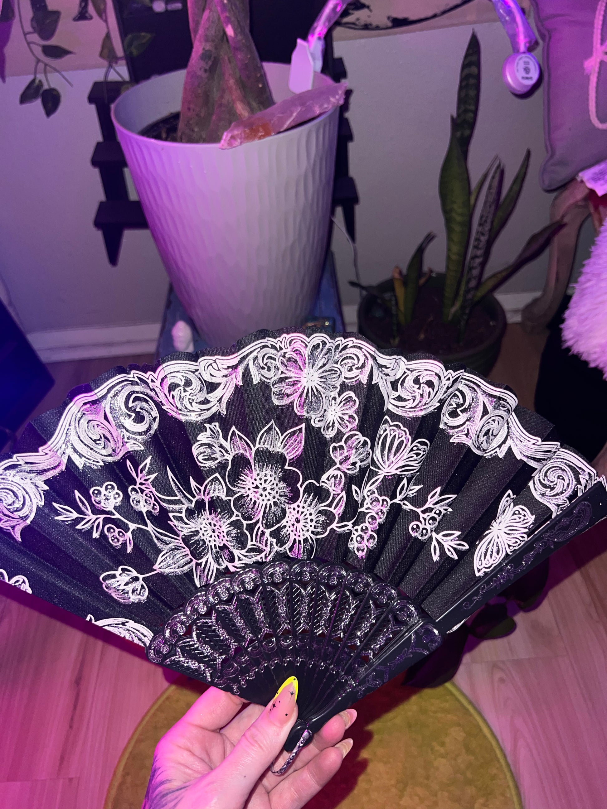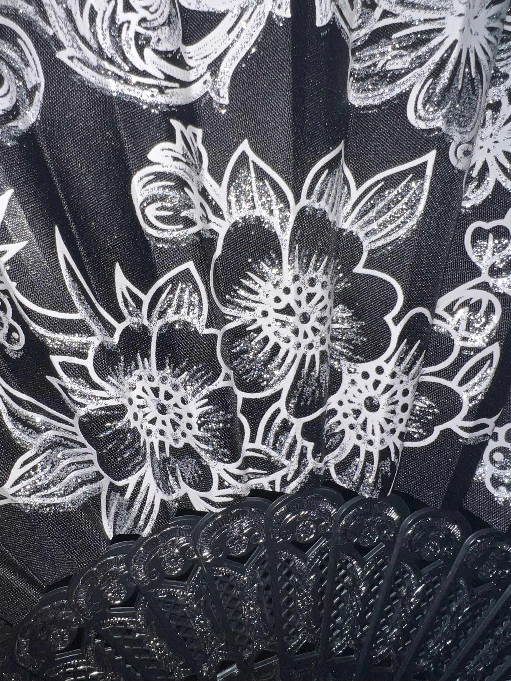 Japanese floral folding fan. Lace with glitter. Fits perfectly in a purse or travel bag. I have 2 colors in-stock, white and black. Cute for use or decor!